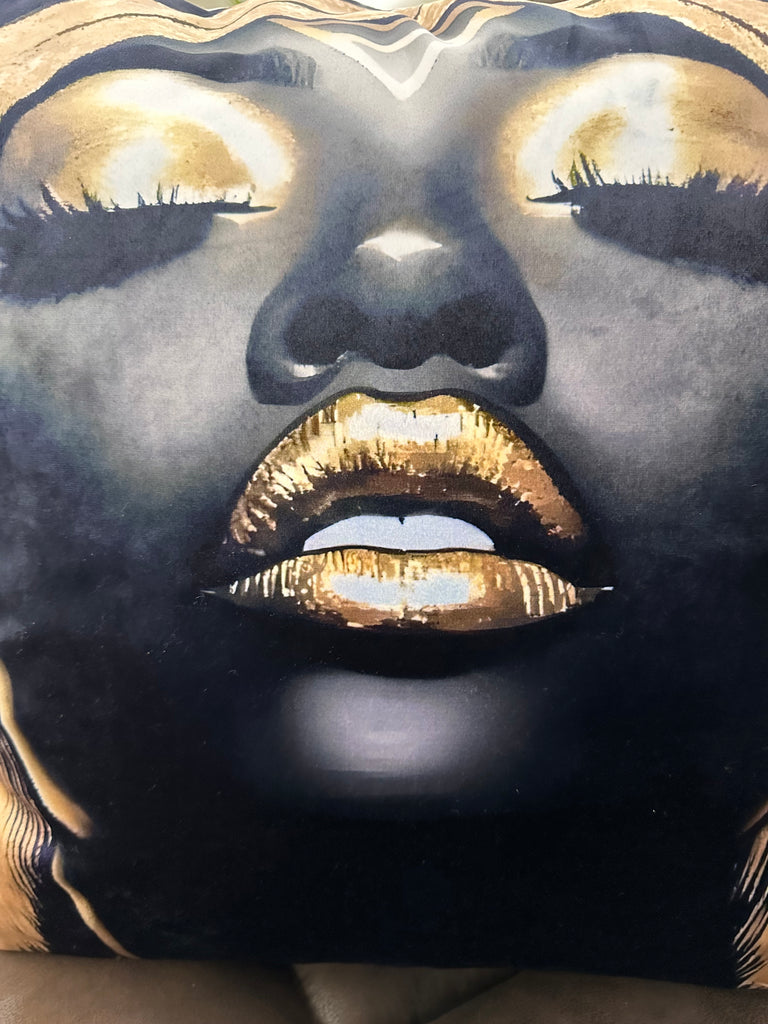 Perfect as a statement piece on sofas, beds, or feature chairs, this cushion blends art and décor effortlessly. Its bold contrast and luxurious tones make it ideal for modern, glam, and Afrocentric interiors looking for expressive, high-impact style.