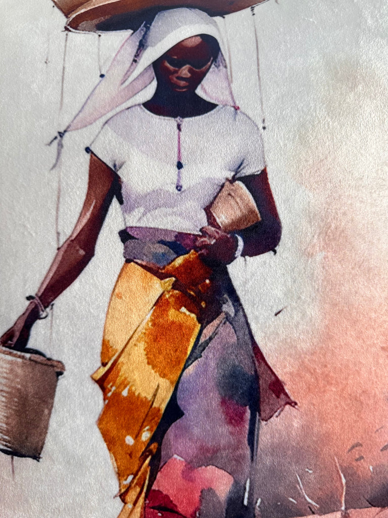 Add a touch of cultural elegance to your home with the African Lady Walking Scatter Cushion by Mel Design. This 60x60cm cushion features a graceful depiction of an African lady in motion, blending artistic detail with a modern, expressive aesthetic.