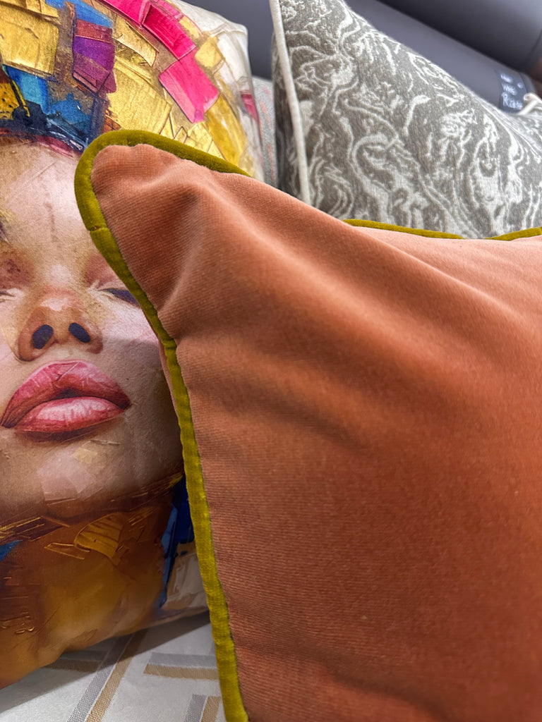 Velvet Salmon Scatter Cushion with Chartreuse Piping